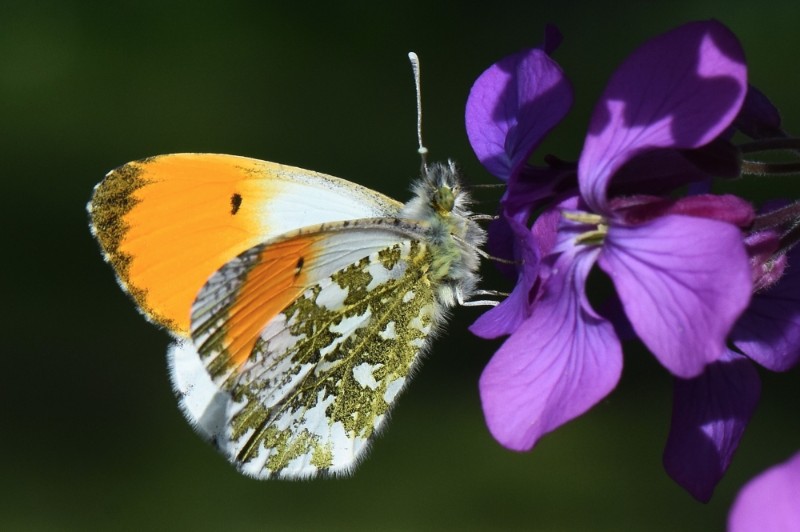 L’Aurore tient son nom du soleil levant, les ailes du mâle étant blanches à bordure noire et ornées d’une grande tache orange, rappelant le soleil à l’aube. Ce papillon présente un dimorphisme sexuel marqué, les femelles ne possédant pas de tache orange sur leurs ailes, chez les deux sexes le revers des ailes est blanc tacheté de vert. Vous trouverez ce petit papillon de 4 cm jusqu’à 2200 m d’altitude, de fin février à juin. L’Aurore vit en lisière de bois, cependant, elle est friande de milieux fleuris comme les prairies, clairières, talus herbeux et bords de routes. Cette attirance est due au fait que ses plantes hôtes sont toutes des fleurs de la famille des brassicacées, principalement l’Alliaire officinale, la Cardamine des prés et l’Arabette hérissée. Profitez d’observer ces magnifiques fleurs pour essayer de prendre en photo la superbe Aurore.