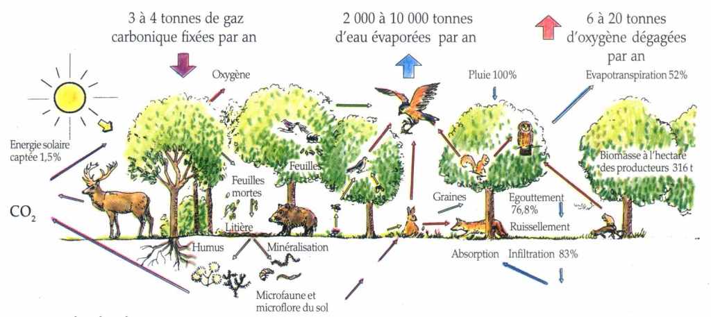 Les arbres sont au centre de ce système : ils transforment l’énergie solaire en matière organique, offrent un abri aux mammifères et aux oiseaux, et permettent la croissance de plantes herbacées. Leurs racines maintiennent le sol en place et empêchent son effritement et sa dispersion. Le sol est en charge du recyclage des matériaux grâce à ses strates de litière, d’humus et aux microorganismes qui le composent.