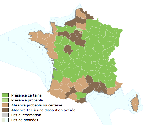 Absence probable, certaine voire avérée en Corse, dans le sud-ouest, en Bretagne, en Ile-de-France et dans le nord.